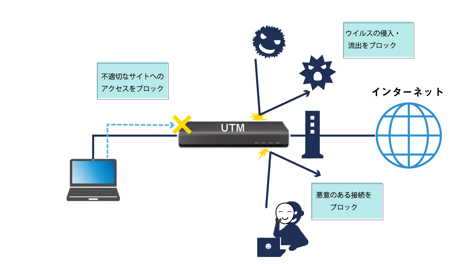 代表的なものは「UTM(Unified Threat Management)」という装置で「統合脅威管理」を指します。ネットワーク出入口に設置することで、外部から社内ネットワークへのウイルスの侵入や、悪意のあるアクセスを防ぐことが出来る仕組みです。