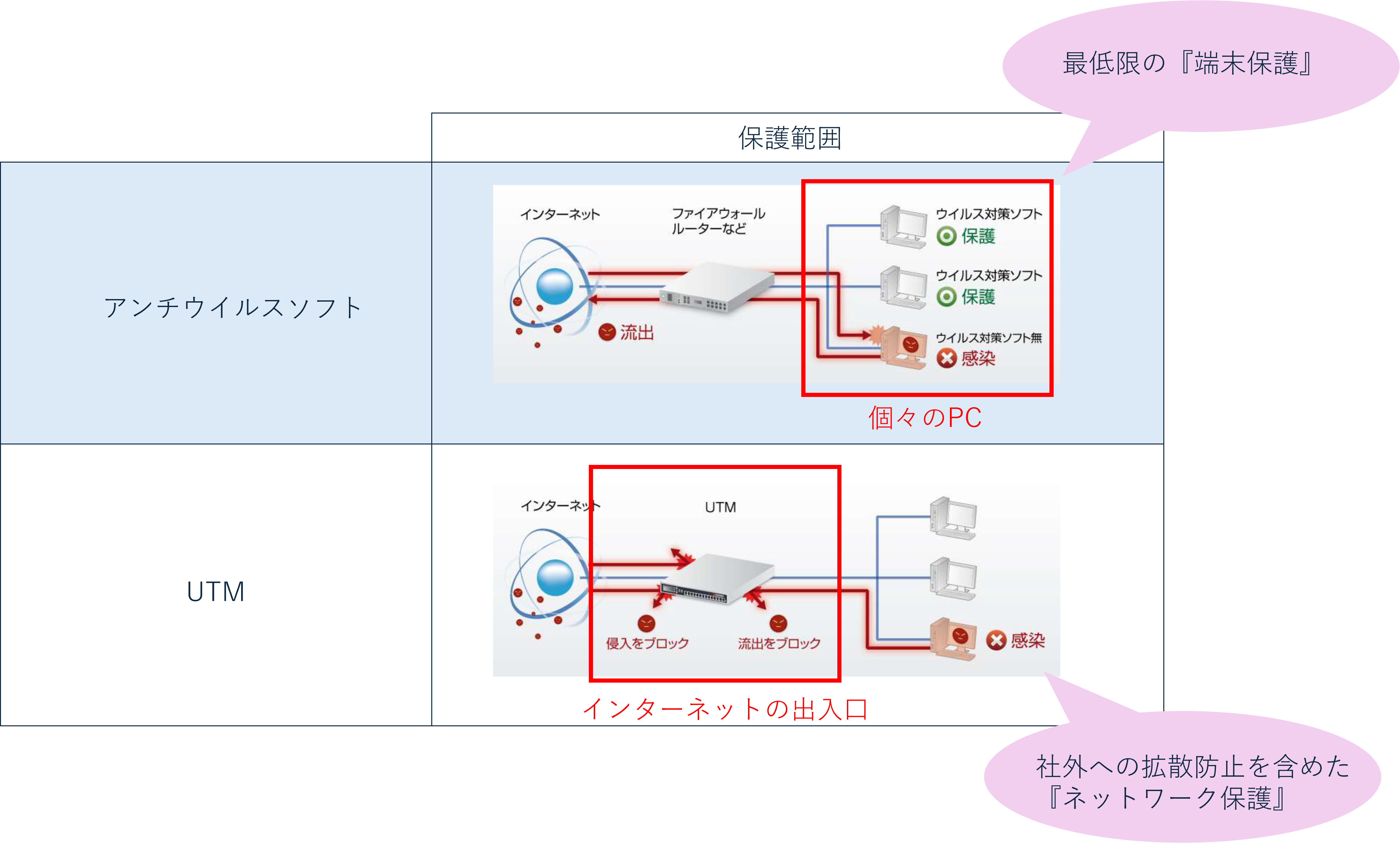 アンチウイルスソフトとの違いは一つの端末のみではなく、インターネットの出入口を通るすべての通信を監視できるところです。