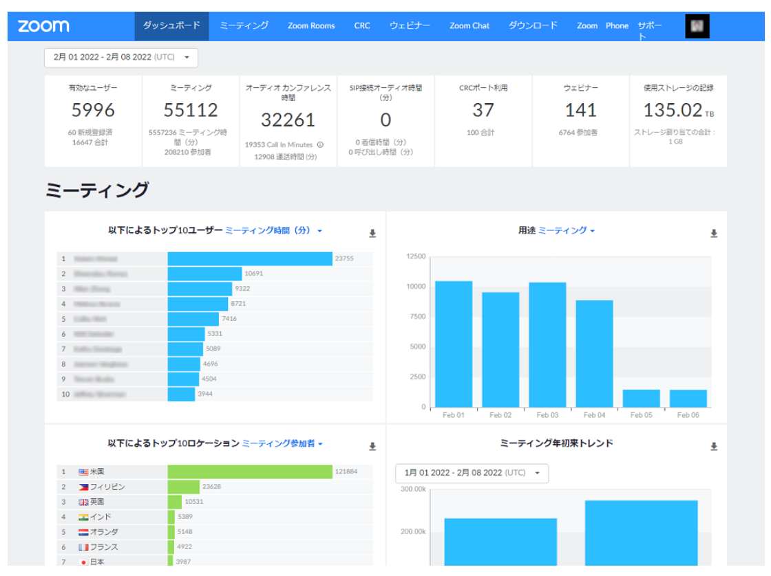 管理者が社内のZoom活用状況を一覧で見ることが出来るダッシュボード機能があります。ユーザー数やミーティングの開催数、時間、参加人数、利用端末の情報などを把握することが出来、導入効果の確認や報告、今後の端末選定にご活用いただけます。